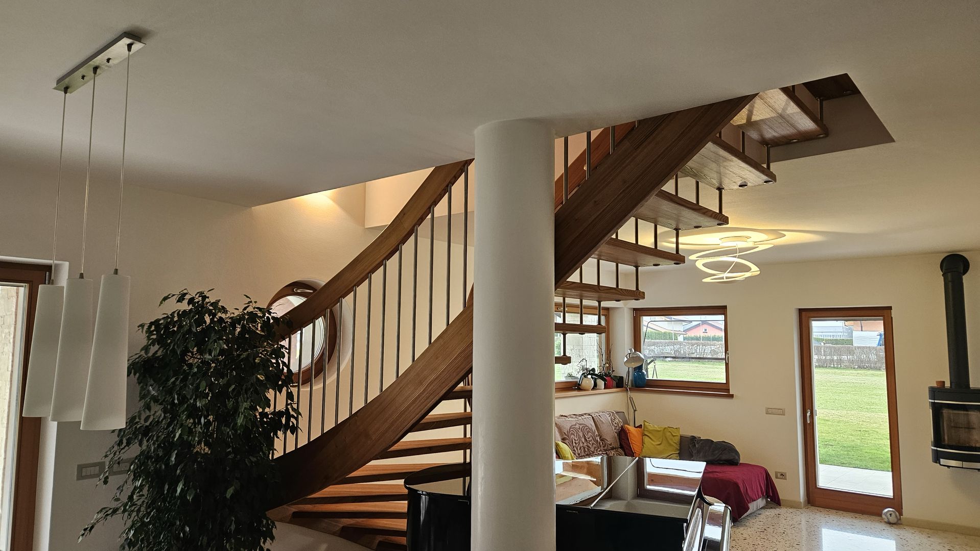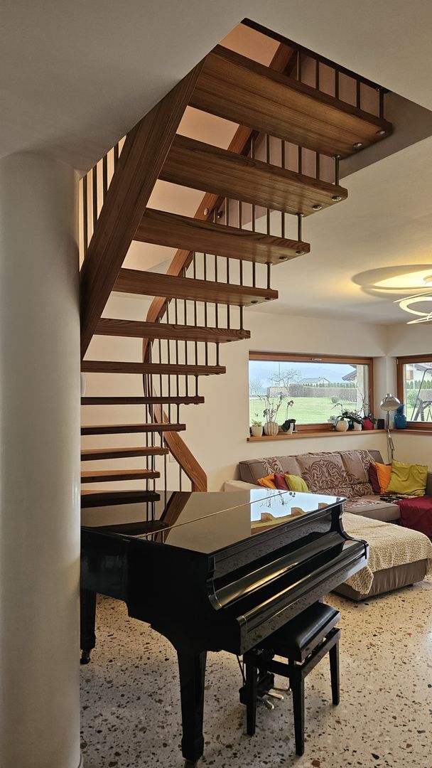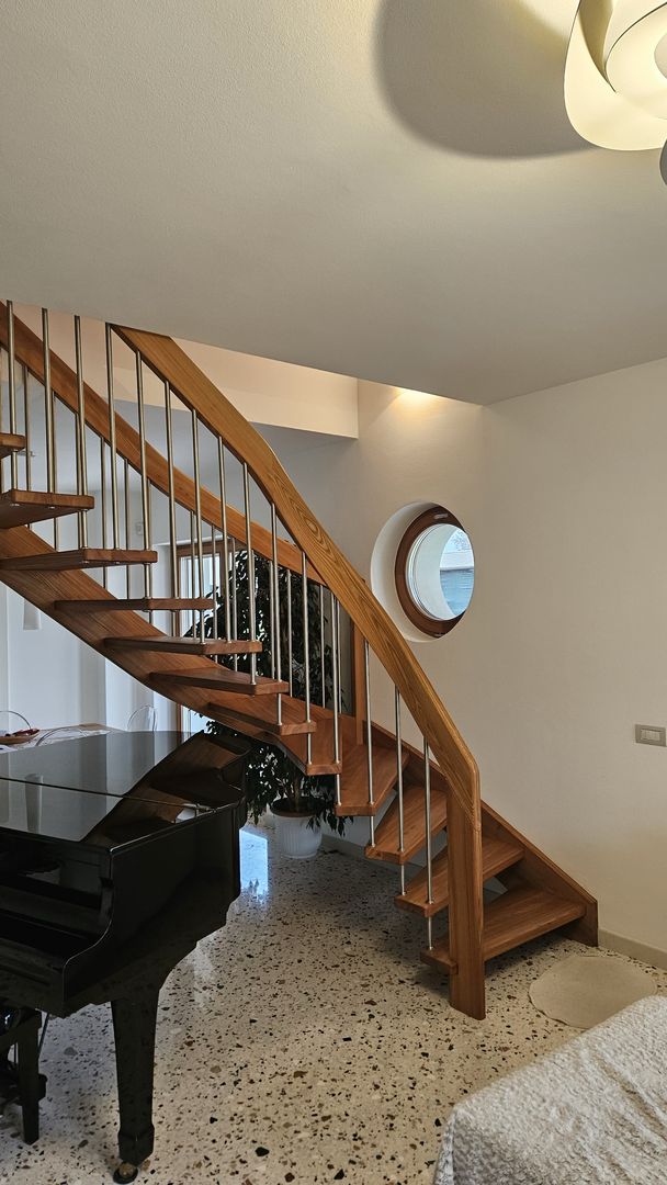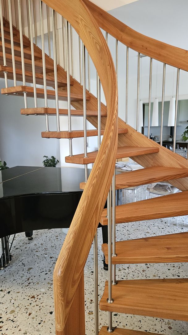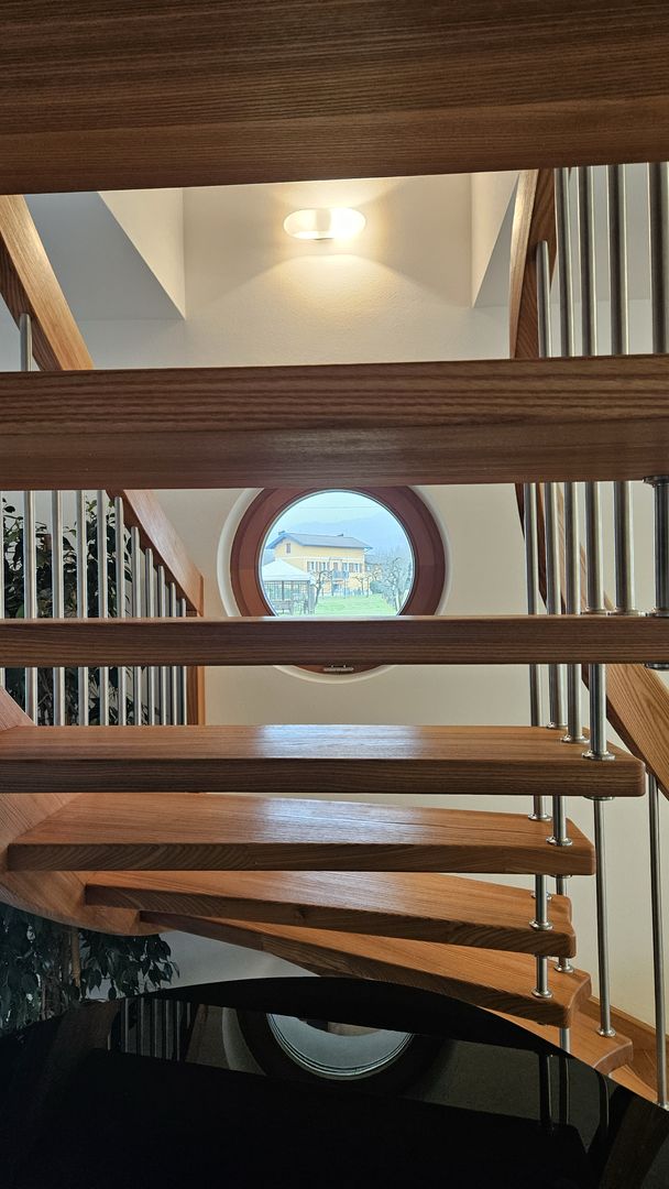 Scala in olmo americano con corrimano elicoidale portante. Villa a Belluno