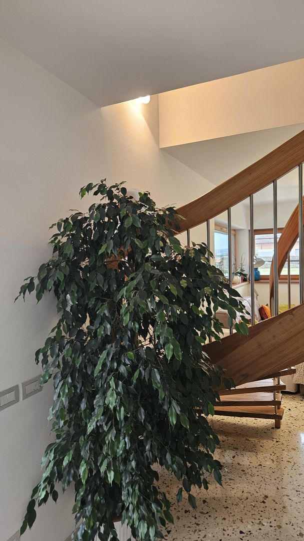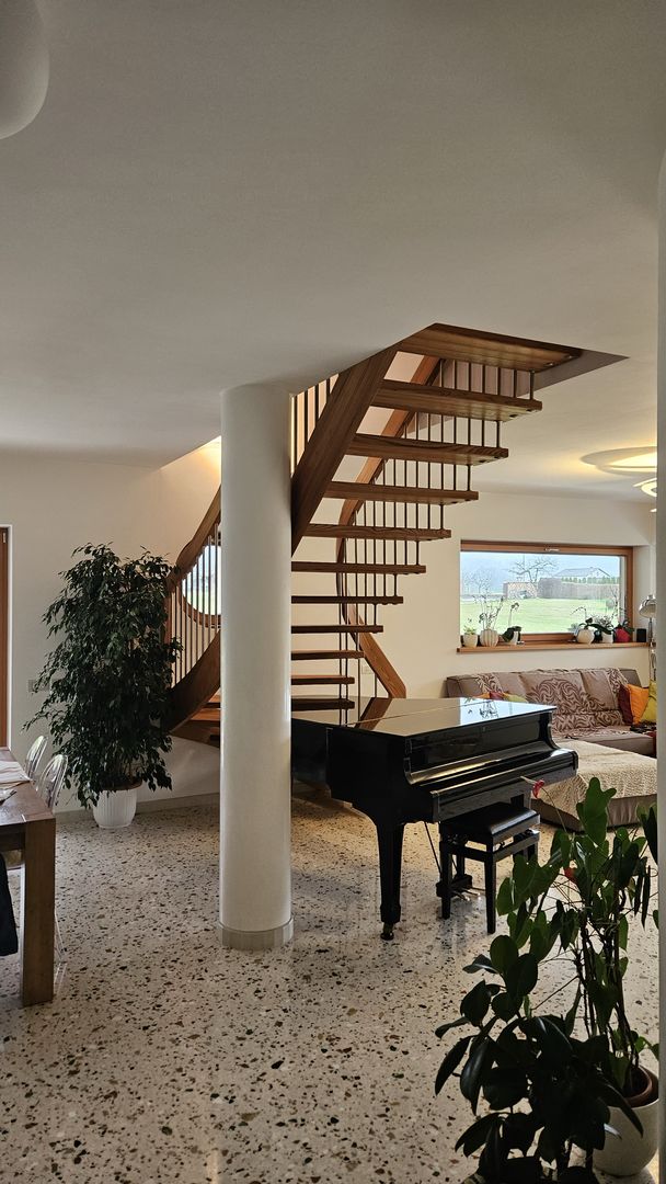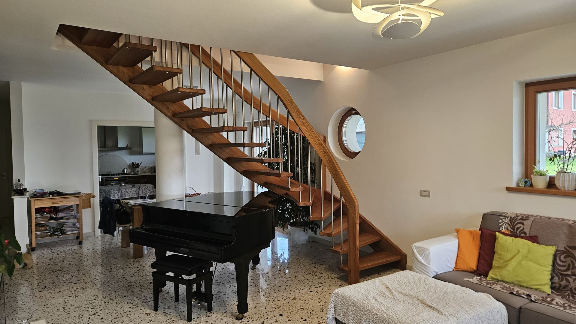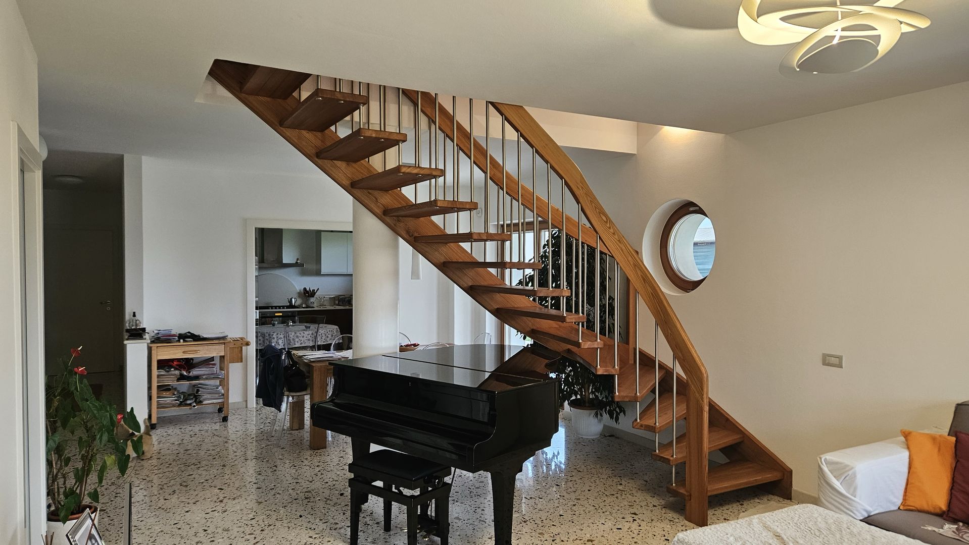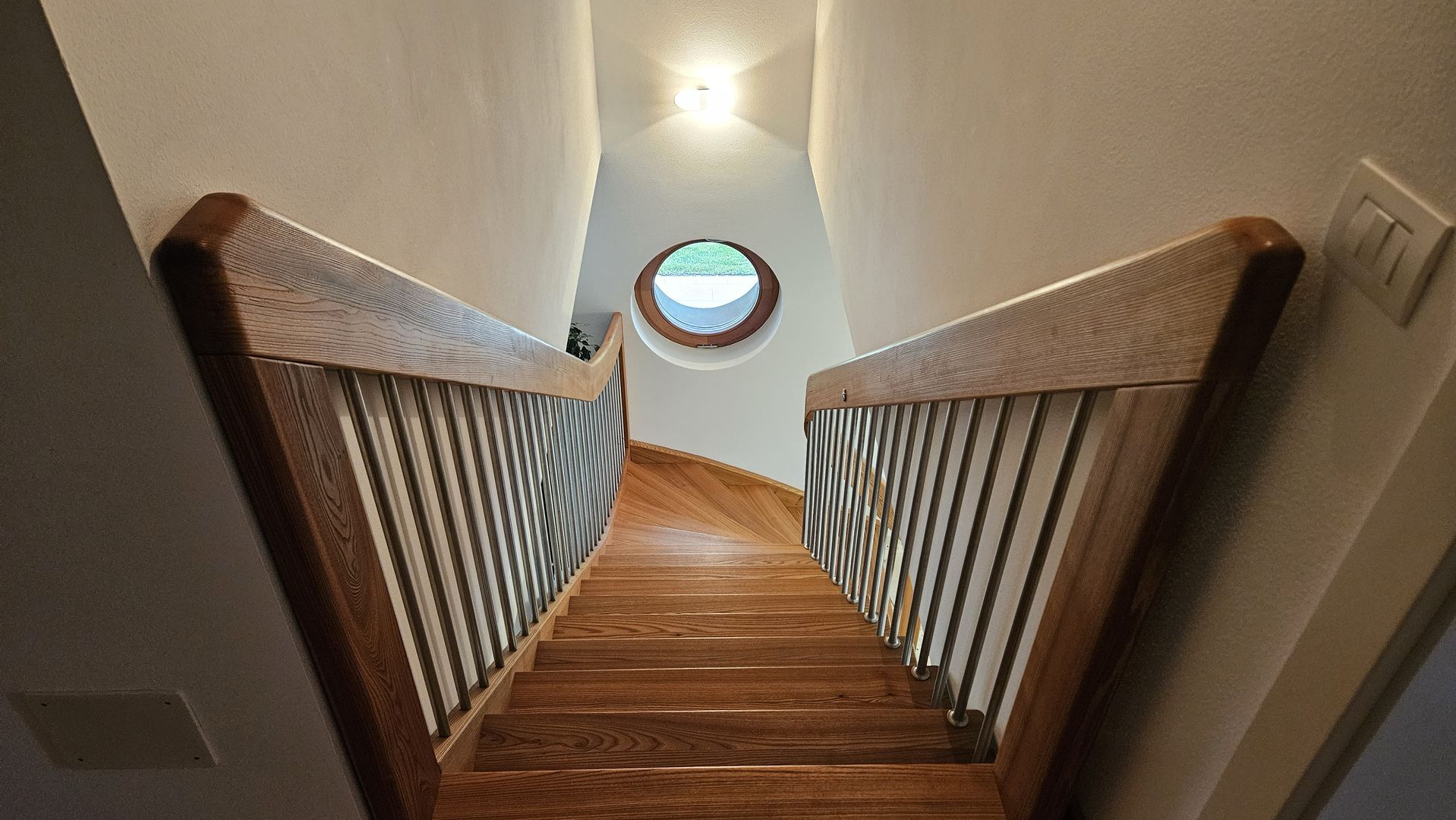 Scala in olmo americano con corrimano elicoidale portante. Villa a Belluno